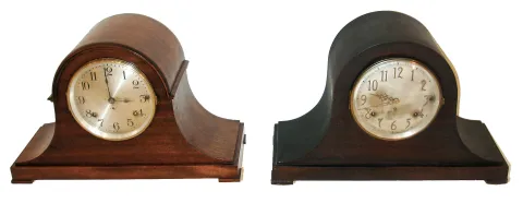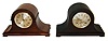 Clocks- 2 (Two): Seth Thomas Clock Co., Thomaston, Conn., ÒChime Clock No. 59Ó, 8 days, time and strike, with quarter hour strike on rods, spring brass movement Tambour style mantel clock. (2) Seth Thomas Clock Co., Thomaston, Conn., ÒChime Clock No. 57Ó, 8 days, time and strike, with quarter hour strike on rods, spring brass movement mantel clock. (1) Mahogany veneered case in a very dark original finish with a couple minor scratches. Original silvered dial is tarnished with worn areas at the winding arbors. Original hands. Ht 11 1/2Ò (2) Refinished mahogany veneered case in nice condition Original silvered dial with some tarnished areas, scratches and wear at the winding arbors. Original hands. Ht 11 1/2Ó