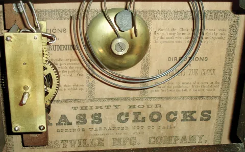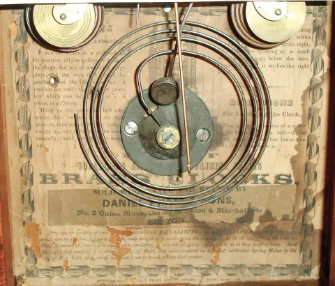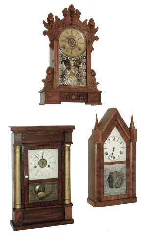 (1) The case has been nicely refinished. The dial pan is new. The hands are original. The label is in good condition. Both glasses are original with the lower frosted glass showing some wear. The movement is signed ÓC. Boardman, Bristol, ConnÒ. Ht 19 3/4Ó. (2) The finish has worn fairly thin in some areas. There is some loss to the top of the right gilt half column. The original painted dial shows fading of the numbers and chapter ring and paint loss at the mounting holes. The hands are original. The movement is signed J. C, Brown, Forestville, Conn. Ht,19Ò. (3) The case has been nicely refinished. The original paper dial has darkened with age. The hour hand is original but the minute hand is a replacement. The original stenciled glass shows minor wear. The case back has a nice label. Ht 20Ó.