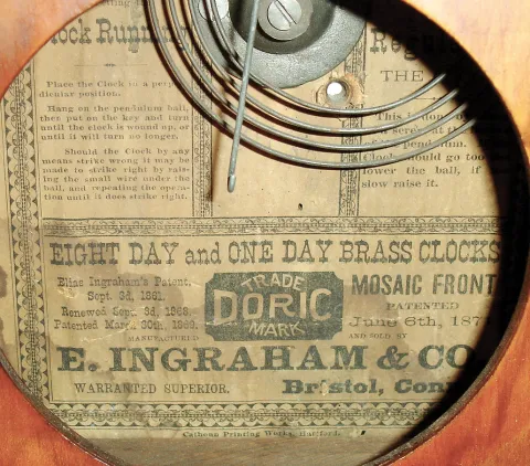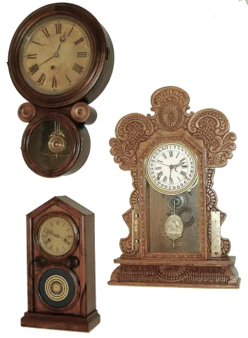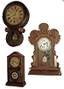 Clocks- 3 (Three): (1) Ingraham Clock Co., Bristol, Conn.unidentified model shelf clock with spring driven, 8 days, time & strike movement in an oak case, c1915. (2) E. Ingraham & Co., Bristol, Conn.ÒIonicÓ wall hanging clock with an, 8 days, time only, movement in a rosewood veneered case, c1890. (3) E. Ingraham Clock Co., Bristol, Conn.ÒDoric No. 2Ó shelf clock with a spring driven, 30 hours, time and strike, movement in a rosewood veneered case, c1880. (1) The case retains its original finish. The movement is signed. The hands are original. The paper dial is a replacement. The stenciled glass is original, but quite worn. Ht 22 1/2Ò. (2) The case has its original finish. The movement is signed. The original paper dial has darkened with age. The hands are original. Both door glasses are probably original. Ht 22Ó. (3) The rosewood case has a nice original finish. The paper dial has darkened with age. The hands are probably original. The movement is signed. The lower tablet is in very nice condition, Ht 16Ò.