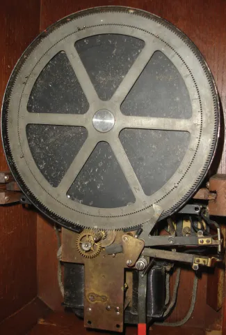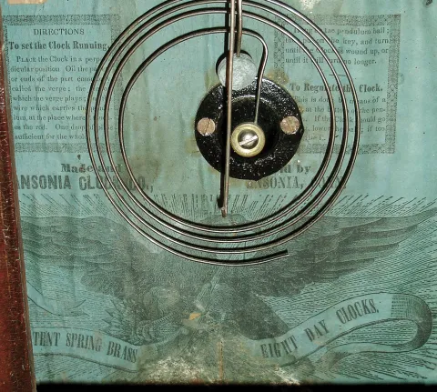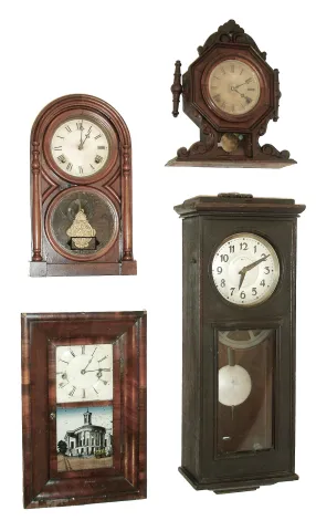 (1) Mahogany and rosewood veneered case in original finish with loss on the outer banding. Original painted dial with wear and loss at the mounting pins. Original tablet. (2) Mahogany veneered case in original finish. Bottom tablet now clear. Paper dial has age darkened a little with stains. Period hands. Pendulum may be replaced. (3) Walnut case in original finish. Bottom access door is missing. Original paper dial has age darkened. It looks like this clock was mounted on a base that is now missing. Original hands. Remains of a label on the back of the case. (4) The case looks to be made of oak in original finish with a small piece of wood replaced on the bottom. The door probably had a couple of narrow strips as evidenced by the notches in the molding in the lower section. Original silvered dial with some wear and fine scratches. Original hands and pendulum