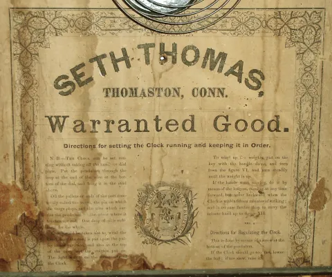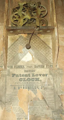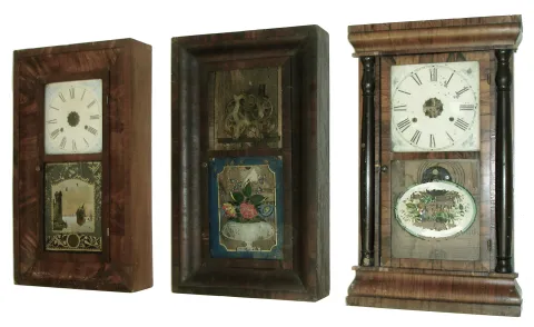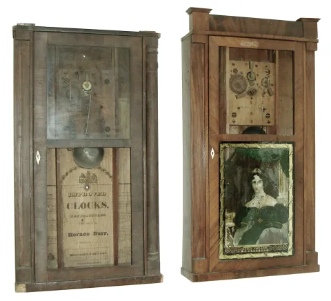 (1) Hoarce Burr, half-column. No dial, weights, pendulum or hands, Top, one column and tablet missing, (2) Atkins & Downs, No dial, hands, weights or pendulum. Top glass missing. Lower glass of ÒQueen AdelaideÓ with loss. Columns missing and splat replaced. (3) R. Blackslee, No dial, hands, weights or pendulum. Both glasses original with loss to the tablet. (4) Seth Thomas, No hands, pendulum or weights. Metal dial with loss and over painted. Tablet with heavy loss. (5) Waterbury Clock Co., One weight, pendulum and hands missing. Paper dial on what appears to be original blank. Original tablet with loss.