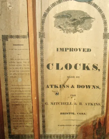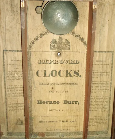 Clocks- 5 (Five): (1) Horace Burr, Dundas, UC, Canada, 30 hours, time and strike, weight wood movement shelf clock, c1835; (2) Atkins & Downs for G. Mitchell & R. Atkins, Bristol, Conn., 30 hours, time, strike & alarm, 30 hours, wood movement shelf clock,