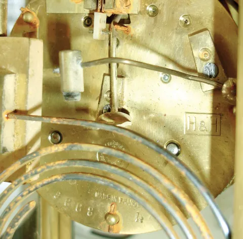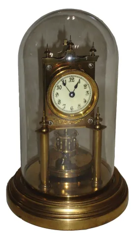 (1) this smaller model has an older worn tarnished surface, the beveled glasses are fine, the white enamel dial has a few tiny chips around the winding holes. Sadly, we see rust on some of the steel components, it is not ticking or striking, and the pendulum is absent. Ht 8 1/4Ó (2) the brass retains an original old patina with expected wear and tarnish. The enamel dial is fine, as is the ornate disk pendulum. The torsion spring is good and the movement ticks but was not tested long term. Ht 11 1/2Ò to top of dome