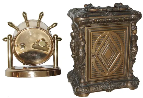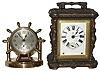 Clocks- 2 (Two): Chelsea Clock Co., Boston, for Abercrombie & Fitch, ÓClintonÒ, 8 days, brass, time only, swivel desk clock, 196450 c1930; Ansonia Clock Co., New York, NY, ÓCometÒ, 30 hours, time and alarm cast metal carriage clock, c1904