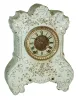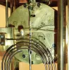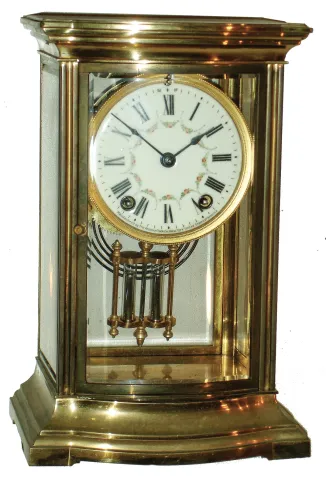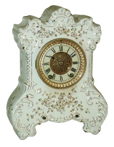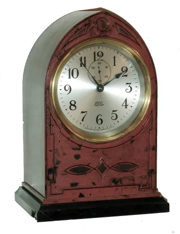 (1) the brassÕs lacquer has darkened and dulled, but there is no damage or losses to the case. The beveled glasses all are good, as is the multicolor enamel dial and simulated mercury pendulum. The movement ticks and strikes but was not tested long term. Ht 11 1/4Ó (2) the porcelain case is intact except for a bit of discoloration below the dial. The rear paper label remains. The paper dial chapter ring, surrounding the fancy gilt center, probably is a replacement for the original porcelain version. The signed movement ticks and strikes but was not tested long term. The hinged rear door is absent. Ht 10Ò (3) Bakelite or ÓMorsiteÒ cased model in very clean condition. The original silvered dial is near-pristine. Hands are original. For details, see Tran LyÕs book titled American Clocks, Vol 2., page 171. Requires two ÓDÒ batteries, looks clean and complete but not tested. Ht 10Ó