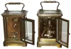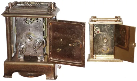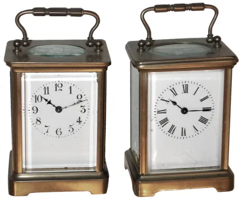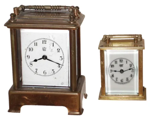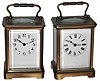 Clocks- 4 (Four) brass and glass carriage clocks, c1900: (1) Two French, 8 days, time only; (2) Two Waterbury 30 hours, smaller one is the ÒMidgeÓ, larger is ÒConductorÓ with alarm (1) both cases have old dull finishes but no damage or losses, all the beveled glasses are good, and one of the white enamel dials has hairlines below the chapter ring. Both lever-escapement balance platforms appear to be old and are ticking, but not tested long term. Hts to hand tops 5 3/4Ò (2) both are in good original condition with some darkening of the brass surfaces. All the glasses are okay, and both enamel dials are fine. Neither runs so will need service. Hts. 3Ó and 4 1/2Ò
