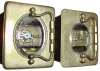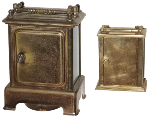 (1) both cases have old dull finishes but no damage or losses, all the beveled glasses are good, and one of the white enamel dials has hairlines below the chapter ring. Both lever-escapement balance platforms appear to be old and are ticking, but not tested long term. Hts to hand tops 5 3/4Ò (2) both are in good original condition with some darkening of the brass surfaces. All the glasses are okay, and both enamel dials are fine. Neither runs so will need service. Hts. 3Ó and 4 1/2Ò