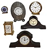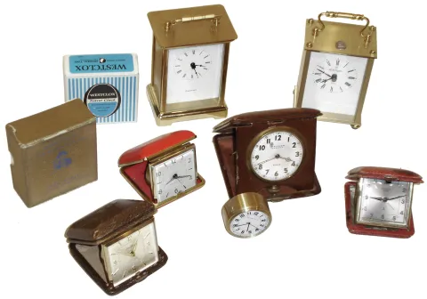 Clocks- 14 (Fourteen): French silver trophy clock ÓAmerican Yacht Club, Second Prize Won By Rascall III, July 3, 1912Ò; Proclocks reproduction small brass carriage clock; miniature wood tambour; Appella small Swiss alarm clock; Bulova round alarm clock; Seth Thomas, 8 days, wood tambour clock; Forum, Shanghai, modern, 8 days, Westminster chime balance wheel clock on simulated burl base with square glass cover, and seven others, all 20th century mostly in good condition, although the regatta trophy clock (from Rye, New York) is missing its hands, but all sold as is and no further details available. Ht of trophy clock is 5 1/2Ó