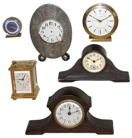 Clocks- 14 (Fourteen): French silver trophy clock ÓAmerican Yacht Club, Second Prize Won By Rascall III, July 3, 1912Ò; Proclocks reproduction small brass carriage clock; miniature wood tambour; Appella small Swiss alarm clock; Bulova round alarm clock;