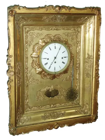 Austrian 2 day grand sonnerie gilt-wood picture frame hanging clock, gong base signed ÒM. Miller & SohnÓ, c1840 the gilding still is in good condition with some losses on the outer door but much better on the visible front inside. The white porcelain dial has some chips around the winding and screw holes. The thread-suspension movement is dark but seems to function properly, but the rate-adjusting arbor is bent and detached. Case is 23Ò x 18Ó x 6Ò