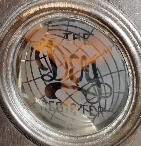 Dey Time Register, Endicott, New York, 8 days duration, time punch clock, c1920 this clock was one of the first time punch clocks invented, by the Scotsman Alexander Dey. Dey Time Register Co. eventually merged with International Time Recorder, also of Endicott, the forerunner of IBM. The case and parts retain its untouched original finish with some loss to paint on time punch wheel. The in and out wheel is missing its paper tabs. There has been an electric light installed inside the case. The original etched glass window with ÓDey RegisterÕ is present and intact and the glass and bezel over the dial are absent. This item is large and heavy and will require custom shipping / handling. Ht 35 1/2Ò