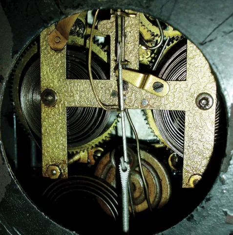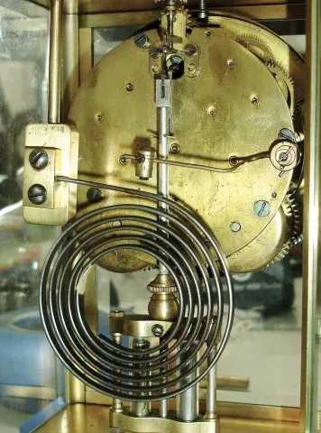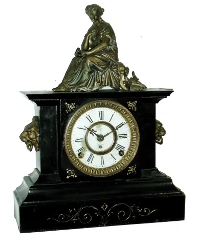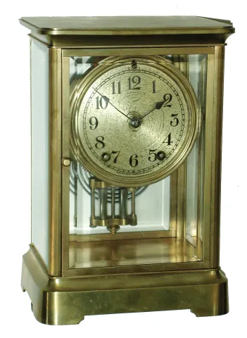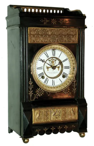 (1) the brass finish is slightly tarnished but retains a nice glossy patina. The silvered dial has many tarnish spots. All the beveled glass panels are good, but the gong stand is loose where it attaches to the case top. The movement ticks and strikes, but not tested long term; its simulated mercury pendulum is fine. Ht 9 3/4Ó (2) the original black surface is mostly intact, with a few small areas of finish loss. The cast metal ornamental plates look good, as does the beaded bezel. The thick beveled glass has a chip; the white enamel dial has a few hairlines and chips. The visible pallets are steel. The movement ticks and strikes, but the pendulum is absent and it was not tested further. A nearly complete rear paper label confirms the model name. Ht 16 1/2Ò (3) the original black surface has minor wear and losses, and some of the incised gold is present. The seated top figure, not shown in the Kroeber book, but usually optional, is intact and retains an old patina. The signed white enamel dial has several cracks and visible repairs; the glass in its beaded bezel is okay. The movement ticks and strikes but was not tested long term Ht 16 1/4Ó