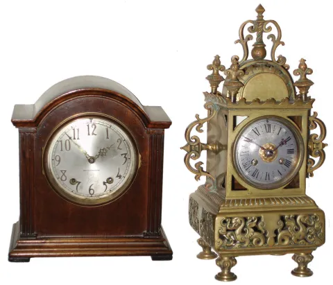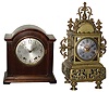 Clocks- 4 (Four), 8 days, time and strike, mantel clocks: (1) French cast brass, late 19th century; (2) Seth Thomas probably Patrician No. 1 (or No. 2) model mahogany bracket, c1928; (3) Seth Thomas miniature reproduction mahogany violin clock, 30 hours,