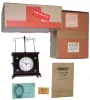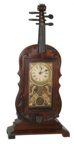 Clocks- 4 (Four), 8 days, time and strike, mantel clocks: (1) French cast brass, late 19th century; (2) Seth Thomas probably Patrician No. 1 (or No. 2) model mahogany bracket, c1928; (3) Seth Thomas miniature reproduction mahogany violin clock, 30 hours, time only, period pendulum driven movement, 20th century; (4) The Horolovar Co., Bronxville, New York, NY, ÓIgnatzÒ, 8 days, reproduction novelty mantel clock, postmark 1965 on original cardboard box with original documents (1) the heavy French clock (note top is NOT attached) has an old patina, darkened silvered dial, and good beveled convex glass. Its movement, signed ÓM.S.Ò strikes on a bell, ticks and strikes, Ht 13 1/2Ó; (2) The Seth Thomas case has a nice smooth original finish, signed silvered dial with a bit of brass showing through, and applied brass numerals. Its balance wheel No. 125 round movement strikes on a gong, Ht 8Ò (3) This is a cute and nicely made reproduction, although the plywood back would appear better if painted black or stained dark. The door glass needs to be secured in place. The movement, with old fancy pendulum, ticks but was not tested long term. Dial is signed paper; hands could be improved. Ht 19 1/2Ó; (4) like new
