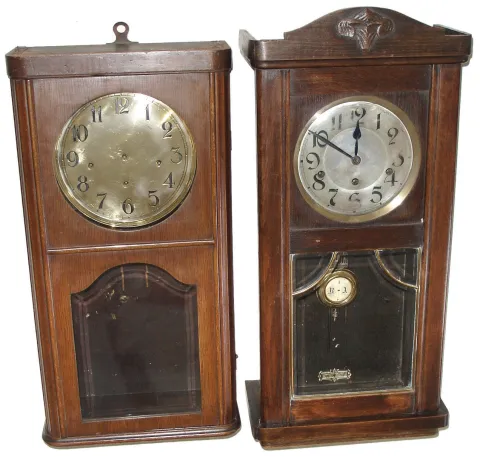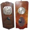 Clocks- 4 (Four), 8 days, Westminster chime spring-driven chime walnut wall clocks: three German and one French (a la Cerbe d/Or, Nice), c1910 all four are in good original and complete condition with no major losses or damage; one convex glass is absent. Metal dials, movements and three pendulums are present, but not tested and sold as is with no further details available. Ht of largest 28Ò