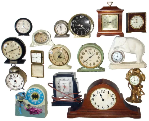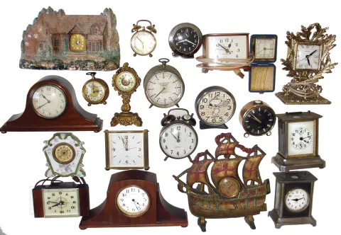 Clocks- 36 (Thirty-six) Desk, Alarm and Novelty: large assortment in two boxes including some early electrics, Waterbury & Jennings Bros. gilt novelties, Westclox, French, Swiss and German models, all 20th century. Most in good condition but not tested and sold as-is. No further details available.