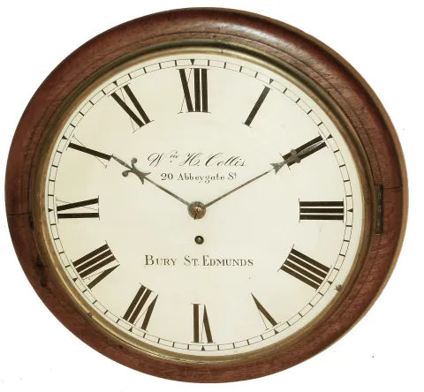 English Dial Clock, walnut, 8 days, time only, fusee, painted metal dial signed ÓWm. H. Collis, 20 Abbeygate St., Bury St. EdmundsÒ, c1900 the solid wood case has been nicely refinished, and the painted metal dial is very good. The brass bezel and glass are fine; the wood bezel has some shrinkage splits; the side door is newer. The unsigned movement ticks. Overall diameter is 14 1/2Ó