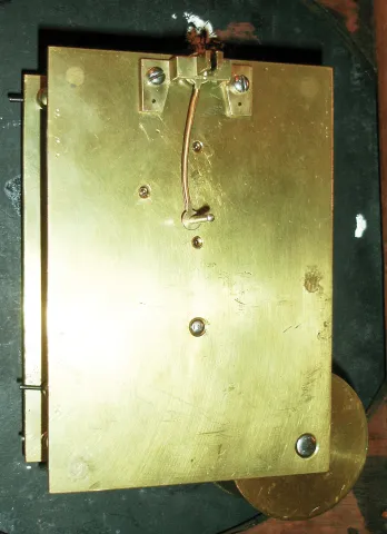 the solid wood case has been nicely refinished, and the painted metal dial is very good. The brass bezel and glass are fine; the wood bezel has some shrinkage splits; the side door is newer. The unsigned movement ticks. Overall diameter is 14 1/2Ó