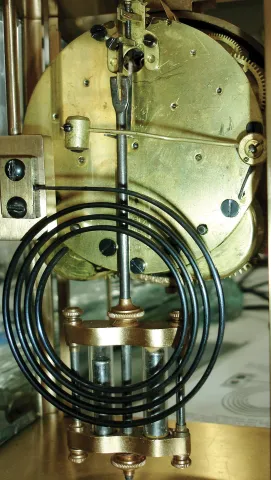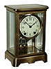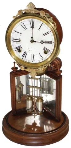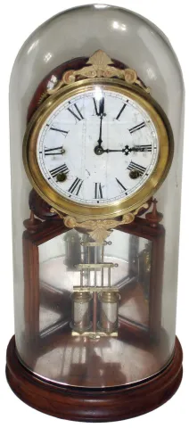 (1) the surface appears to be an old gold finish in very nice condition. The enamel dial, beveled glass panels, and simulated mercury pendulum are fine. The 48S movement ticks and strikes. Ht 9 3/4Ó (2) the wood has been nicely refinished, and the round dome is good. The twin-barrel pendulum may have a newer rating nut, and the paper dial looks old but may not be original. There is a Jersey City retailer label on the rear. The signed movement ticks and strikes. Ht with dome 18Ò