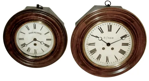 Clocks- 2 (Two) Lenkirch, 8 days, round walnut gallery clocks, Russian dial names: larger time and strike; smaller time only; numbers Ó1 Million 535114Ò and Ó1 Million 144021Ò, 1907 and 1897