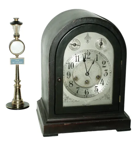 Clocks- 2 (Two), one incomplete: Seth Thomas Clock Co., Thomaston, Conn., ÓChime Clock No. 71Ò mahogany round top, 8 days, time and Westminster chime mantel clock, 113A movement, c1921, PLUS Swiss ÓRue de la PaixÒ streetlamp stand, no Jaeger LeCoultre movement. the heavy mantel clock retains an old dark worn finish with some flaws. The silvered dial also is worn with some brass showing through, and the minute hand is short. The large movement ticks and chimes, but not tested long term. The front glass is flat and newer. Ht 13 1/2Ó. The miniature streetlamp needs tightening and a clock insert, or use for parts. Ht 11Ò