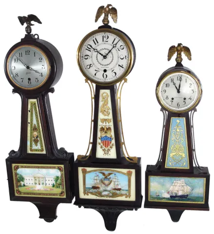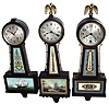 Clocks- 6 (Six) American banjo wall clocks: (1) Seth Thomas ÒDuffieldÓ plug-in electric; (2) Seth Thomas ÒSpecial No. 28Ó, (3) Seth Thomas ÒBanjo No. 4Ó; (4) Seth Thomas ÒSpecial No. 28Ó, c1932; (5) Sessions ÒAldenÓ, c1927; (6) Seth Thomas ÒBanjo No. 1Ó, c1927 (1), (2) & (3) arethree nice examples in very good condition. The ÒDuffieldÓ has the Boston Tea Party lower glass. One missing eagle finial. Not tested, sold as is. Largest clock 30Ò high; (4), (5) & (6) are complete and in very good original condition. The largest has some dial paint loss. Not tested, sold as is. Ht of largest is 36Ó