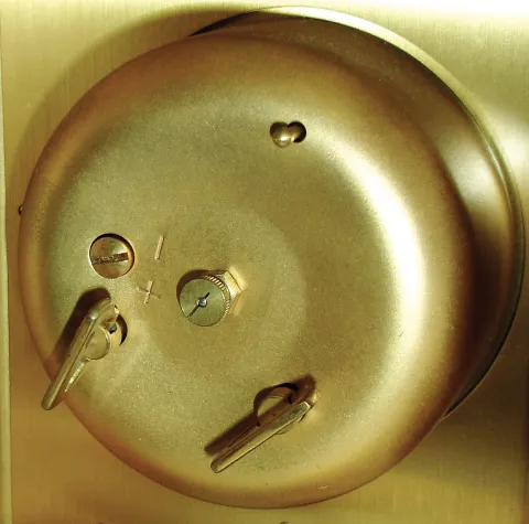 this very heavy high-quality modern clock is in nearly new condition with no damage to the ornate case or thick beveled glass. The jeweled movement ti...