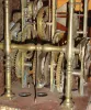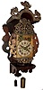 the paint has worn and faded on the wood and metal surfaces, but the overall condition is good for its age. The movement needs cleaning but appears to function properly. The alarm hand is absent, as are the weight chains. Heavy and fragile for shipping. Overall height of bracket is 27Ò