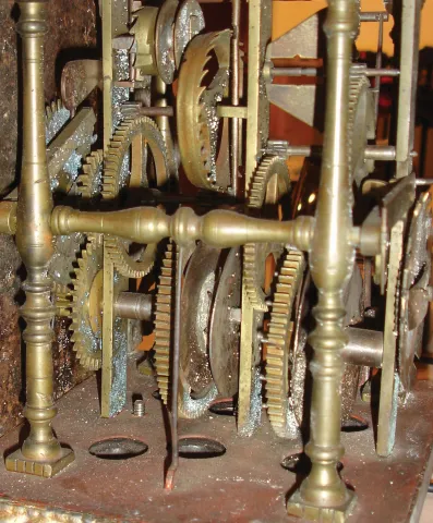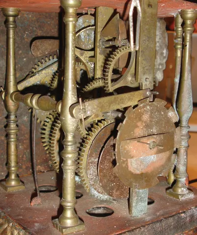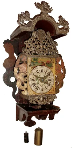 Dutch Friesian, 30 hours, weight-driven time, strike and alarm Stoelklok with painted wood hooded wall bracket, crown wheel and verge escapement, c1820 the paint has worn and faded on the wood and metal surfaces, but the overall condition is good for its age. The movement needs cleaning but appears to function properly. The alarm hand is absent, as are the weight chains. Heavy and fragile for shipping. Overall height of bracket is 27Ò