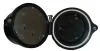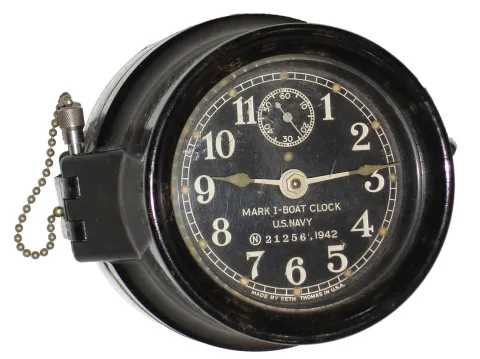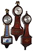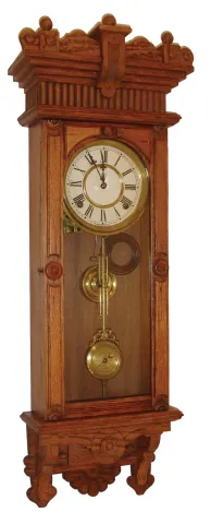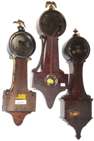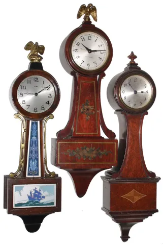 (1), (2) & (3) all three hardwood cases are in very nice condition with good finishes. Dials, glasses and finials are good. Two have rear paper labels; painted glass tablets on the New Haven are good. Not tested, sold as is. Ht of longest is 18 1/2Ó (4) the black phenolic shows the usual mottling, but is undamaged and retains the rear mount plate. The black dial is good, with some fading of the luminous hour dots. The rear-wind movement ticks but was not tested long term. Overall diameter is 5Ò (5) Refinished oak case. The crest above the top molding has been nicely restored with the exception of the wrong choice for the finials. The front piece and the two side brackets on the base has also been nicely restored. Original painted dial with some small repair patches in the center area that are not well matched. Original hands and pendulum. Remains of original label on the back of the case. Ht 33 1/2Ó