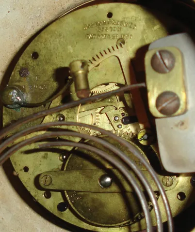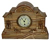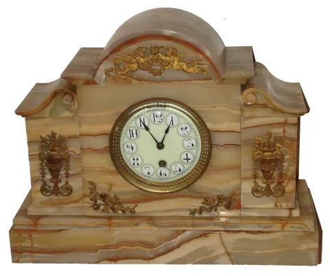 Boston Clock Co., Boston, Mass., tandem wind, 8 days, time and strike, balance wheel in onyx architectural case, c1895 this heavy case is in remarkably good condition with just a few tiny edge chips. The cream porcelain, with raised white numbers, is pristine. as is the thick beveled glass. The movement strikes, and ticks and stops, and will need service. Fragile and heavy for shipping. Ht 12 3/4Ó