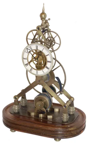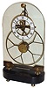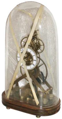 all the brass is somewhat dark, but perhaps intentionally to appear older. The porcelain chapter rings are fine, as are the shaped wood bases. The oversize great wheel clock has a pinwheel escapement but is missing its simple pendulum. The tall dome has a line flaw that may look like a crack, but is not. Hts 19 1/2Ò and 22.5 to top of dome.