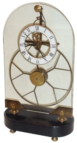 Clocks- 2 (Two) Asian reproduction brass, glass and wood, 8 days, shelf clocks: skeleton, time only, with fusee, large great wheel and oval glass dome; oversize great wheel with round-top glass panel and alarm; late 20th century all the brass is somewhat dark, but perhaps intentionally to appear older. The porcelain chapter rings are fine, as are the shaped wood bases. The oversize great wheel clock has a pinwheel escapement but is missing its simple pendulum. The tall dome has a line flaw that may look like a crack, but is not. Hts 19 1/2Ò and 22.5 to top of dome.