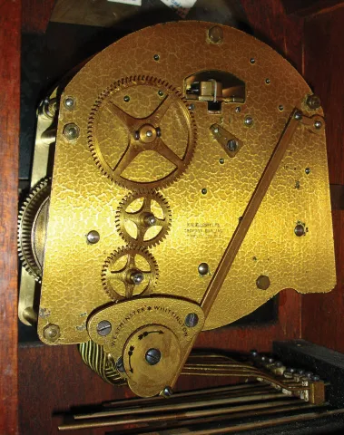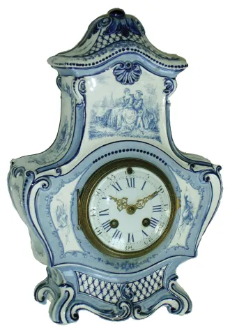 (1) the ornate blue and white case is in nice undamaged condition. The enamel dial, with its blue numbers is good except for small discolored spots. Original gilt hands. The convex beveled glass, in its cast brass bezel, is fine. The signed movement ticks and strikes but was not tested long term. Ht 14Ó; (2) story first, this clock last sold on eBay on 3-12-2006, as item 6610175913, seller petra40cat for the sum of 625 pounds Sterling, or $1,078.50 at the time. It arrived in the US with one of the 8 rods broken [still is], otherwise it is the self same clock, with receipt and photo included that was sold on eBay. Although I am partial to English items, I would guess that our current estimate is closer to the real value. Other than the one broken rod, it is complete and intact, needing only cleaning. Ht 14 1/2Ò