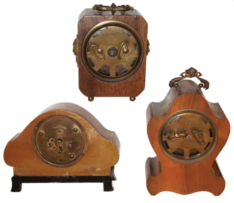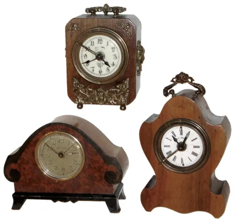 these little ornate solid wood cases are in very good original condition with no losses or damage. One has a front bezel and glass, and radium numbers; the other two never had front glasses. One enamel dial just needs some cleaning; the other has hairlines. Just one is ticking; all three have functioning alarms; but sold as is. Hts 8Ò, 6Ó and 5Ò