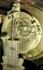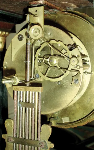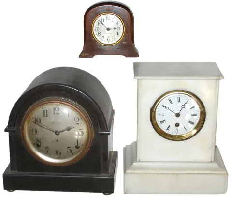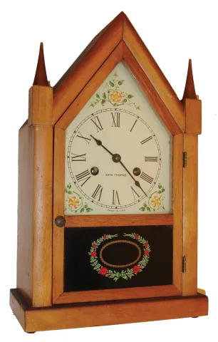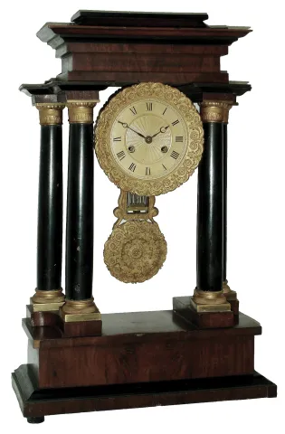 the porticoÕs architectural case has an impressive pediment, finely engraved brass dial and bezel, fancy gridiron pendulum, and ornate column bases and capitals. The movement, with count wheel and bell striking, is unsigned and needs pallet adjustments to engage the escape wheel, Ht 19Ó. The white stone clock has dial hairlines and a chip at the winding hole, and has no pendulum, Ht 10Ò; the desk clock has a worn surface, and is not ticking, Ht 4 1/2Ó; the Adamantine is dark and dirty, its dial is tarnished, and the veneer is peeling off the rear door, Ht 9 1/2Ò. The Seth Thomas shelf clock is in nice condition. Ht 15 1/4Ó.