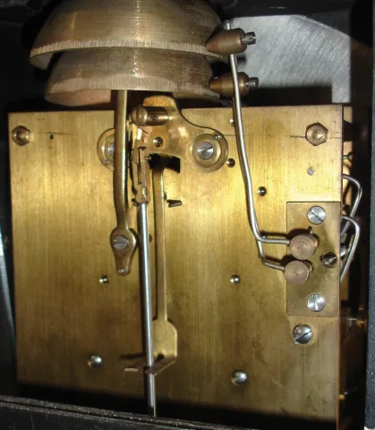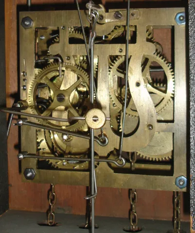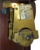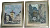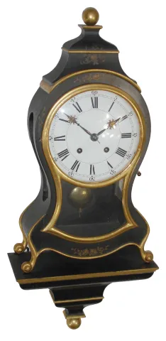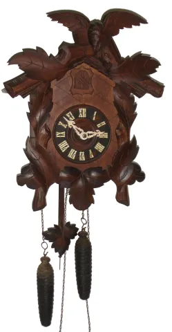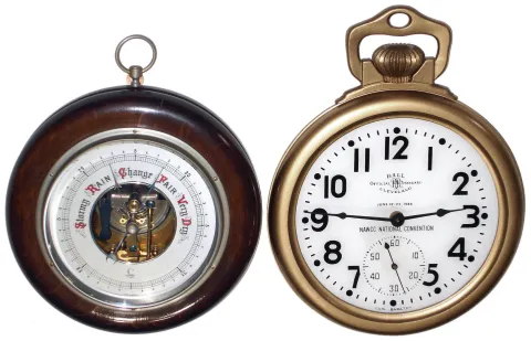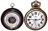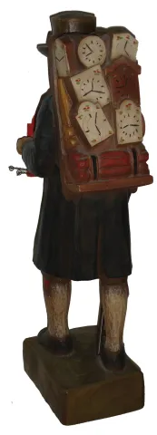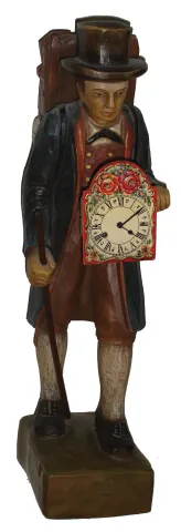 Clocks- 7 (Seven) and a barometer: (1) German modern reproduction of cast-composite clock peddler figure and 30-hour clock, c1980; (2) 1986 NAWCC souvenir quartz-movement pocket watch wall clock; (3) & (4) Bulova Watch Co., Swiss- 2 (Two) prints of old city scenes with working battery-powered clocks within the pictured towers, mid 20th century; (5) German Black Forest 2-weight 30-hour hanging cuckoo clock, early 20th century; (6) Swiss modern Neuchatel style, 8 days, painted wood bracket clock with bracket, quarter strike on two bells, c1985; (7) Horolovar Co., New York [Charles Terwilliger] reproduction ÒHickory Dickory DockÓ mouse clock, 8 days, time with bell on the hour, c1970; (8) Lufft, Germany, aneroid barometer (1) the brightly colored figure is in nice condition, with a chip on the base. The clock winds but the little pendulum is absent. Ht 18Ò; (2) Not tested; (3) & (4) The multicolor prints are in nice condition; one is titled ÓLa Tour de lÕHorlogeÒ, one is ÓRue de la Grosse HorlogeÒ. One frame shows some tarnish; the other is fine. The balance-wheel battery movements were not tested. 9 1/2Ó x 8 1/4Ò; (5) the nicely carved large case is in very good undamaged condition, and there is partial paper label on the rear door. The movement has cast plates, it ticks and strikes, and its bellows have been recently renewed. Ht of case 16 1/2Ó; (6) the paint on the clock case has dulled but remains glossy on the separate bracket. The large white enamel dial is fine, and the gold accents show some slight wear. The fancy hands, with decorative tips, are unusual. The unsigned square movement ticks and strikes, but not tested long term. Ht 19 1/2Ò, bracket adds 7Ó (7) This novelty is in overall excellent original condition, complete with all numerals and original mouse that still has its tail. The Ò1Ó with the 12 has been cleaned and refit, so its color is different. The German 4-jewel movement ticks briefly, and the mainspring felt dry when winding. With this model, you have to be careful when hanging, not to let your wall nail contact the balance platform. Ht 25Ò; (8) Barometer case diameter is 9 1/2Ó