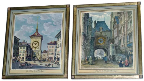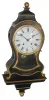 (1) the brightly colored figure is in nice condition, with a chip on the base. The clock winds but the little pendulum is absent. Ht 18Ò; (2) Not tested; (3) & (4) The multicolor prints are in nice condition; one is titled ÓLa Tour de lÕHorlogeÒ, one is ÓRue de la Grosse HorlogeÒ. One frame shows some tarnish; the other is fine. The balance-wheel battery movements were not tested. 9 1/2Ó x 8 1/4Ò; (5) the nicely carved large case is in very good undamaged condition, and there is partial paper label on the rear door. The movement has cast plates, it ticks and strikes, and its bellows have been recently renewed. Ht of case 16 1/2Ó; (6) the paint on the clock case has dulled but remains glossy on the separate bracket. The large white enamel dial is fine, and the gold accents show some slight wear. The fancy hands, with decorative tips, are unusual. The unsigned square movement ticks and strikes, but not tested long term. Ht 19 1/2Ò, bracket adds 7Ó (7) This novelty is in overall excellent original condition, complete with all numerals and original mouse that still has its tail. The Ò1Ó with the 12 has been cleaned and refit, so its color is different. The German 4-jewel movement ticks briefly, and the mainspring felt dry when winding. With this model, you have to be careful when hanging, not to let your wall nail contact the balance platform. Ht 25Ò; (8) Barometer case diameter is 9 1/2Ó