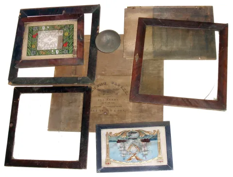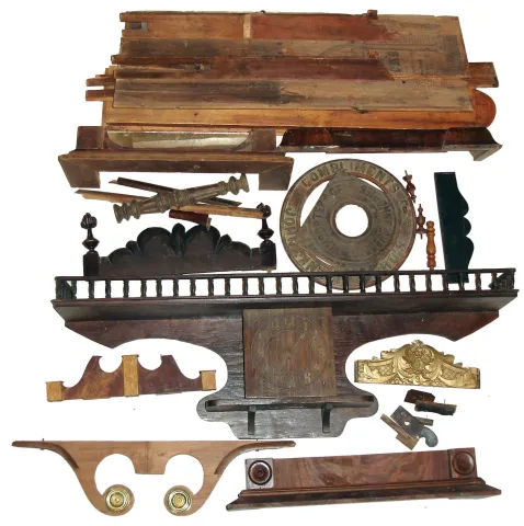 Mixed lot of incomplete large Connecticut shelf clock (probably Forestville), wood clock case parts, glasses, incomplete wall clock with wide shelf top, best is the incomplete large shelf clock which deserves restoration. The rest of this lot is useful for parts and projects. Sold as is, no further details available