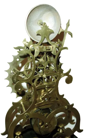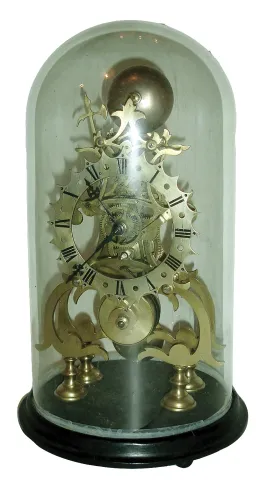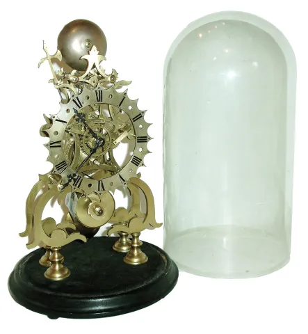 English, a lower caliber single fusee skeleton clock, passing hour strike, with a silvered brass dial and a round glass dome, c1900 although a bit larger than most of the skeleton clocks in this sale, this clock represents work c1900, when frame and dial kits could be purchased in London for converting abandoned fusee pub clock movements into skeleton clocks. The original movement probably became available because the chain broke, now with gut which has likewise failed and will need replacing. Overall a well made clock that will restore nicely. Ht of frame = 12.2Ó, overall with base and dome = 17Ò