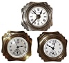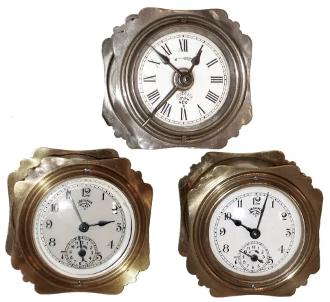 all three are in very good overall original condition; two have front glass, one never did. Two tick, two have working alarms, but sold as is. Ht 3 1/4Ó