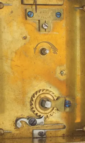 France, carriage clock with champleve enamel decoration, brass case with beveled glasses, Arabic numeral white enamel dial, 8 days, timepiece movement with cylinder platform, c1910 dirty, two glasses with minor corner chips, dial with minor scratches, running