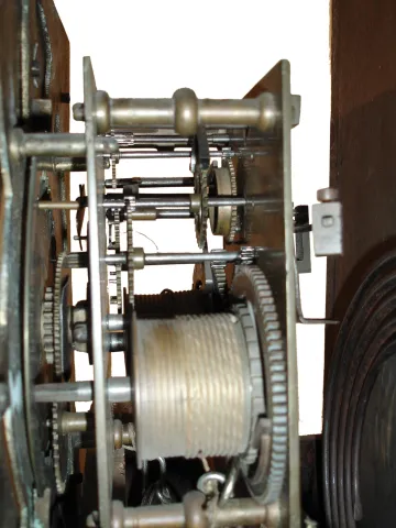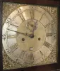 Clock and Clock Case- 2 (Two) English dark oak, mid 18th century cases: (1) Joseph Smith, Chester, England, 8 days, time and gong strike, weight driven movement with square brass dial and silvered chapter ring, highly carved case featuring a king in