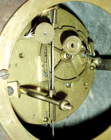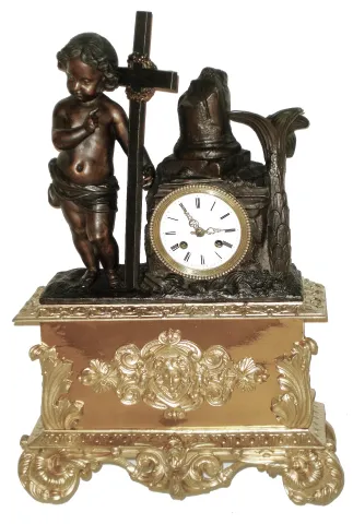French bronzed spelter and gilt metal figural, 8 days, time and strike, thread suspension mantel clock, c1830 the large ornate case, with no damage or losses, has been nicely polished and lacquered, and the porcelain dial is good except for a strengthened VIII. There never were front or rear doors, so this was originally under a dome. The unsigned movement, with count wheel and bell striking, ticks and strikes. Ht 21Ó