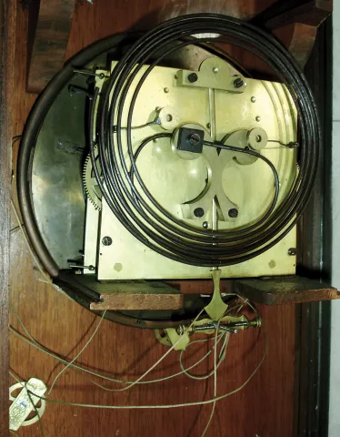 there is a nice glossy finish, probably rubbed out, on the turned and carved ornate case, but the top crest is new and does not quite match. The front...