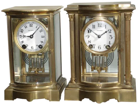 both are in very nice original condition with some darkening of the gold finishes. All beveled glasses and both white enamel signed dials are good. Both have simulated mercury pendulums and signed movements which tick and strike, but neither was tested long term. Ht 9Ò