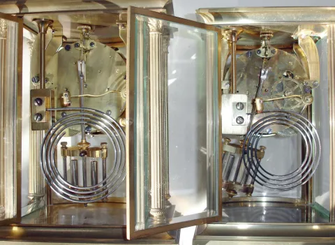 Clocks- 2 (Two) Seth Thomas, Thomaston, Conn., bow-front brass and glass, time and strike, crystal regulator mantel clocks: ÒEmpire No. 48Ó; ÒEmpire No. 65Ó with fluted columns, c1909