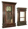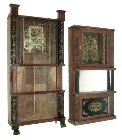 (1) Unknown (probably a Birge firm), Carved half column triple decker case with a movement. No carved splat or center columns. There is no pendulum, weights or dial. (2) C. & L.C. Ives. Mahogany veneered case with minor veneer loss. Bottom tablet is not original. Some newly turned feet inside the case. Entire top is missing as is the verge on the movement. There are no hands, pendulum, dial or weights. (3) Unknown. Nice clock case suitable for parts. (4) Birge & Fuller. Mahogany veneered case in original finish with some veneer damage on bottom OG molding and the top right side OG molding. Bottom glass is missing. Minute hand is missing. There are no weights, pendulum or dial.
