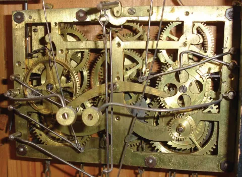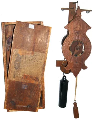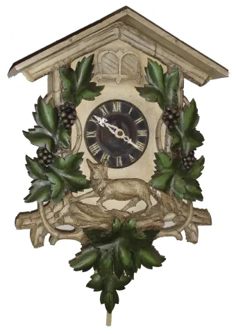 Clocks- 6 (Six): (1) German Black Forest painted wood and plaster 3 weight cuckoo and quail 30-hour hanging wall clock, c1890; (2) Columbus Clock in original wooden box, c192; (3) Bench-made reproduction J. C. Brown French foot ÒacornÓ shelf clock with