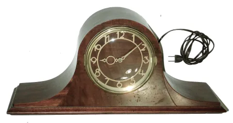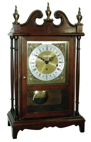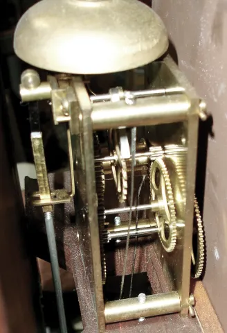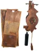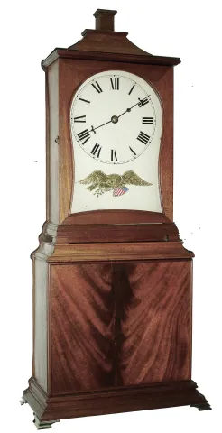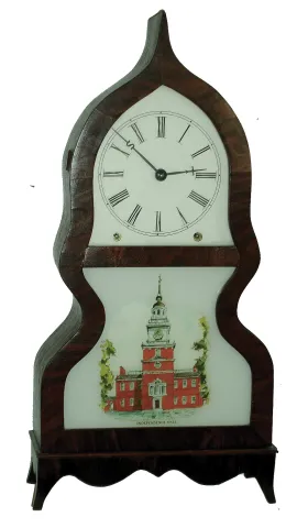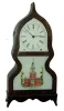 (1) this unusual case is painted white and green, with a fox and grape clusters. The top crest is absent. The cast-plate movement seems to operate, and the bellows have been recently renewed. The old German label remains on the back. Ht of case 19Ò. (2) The Columbus appears complete and original. (3) The ÓacornÒ clock is in very nice condition except for the top door hinge screws which have torn out, Ht 19 1/2Ó. (4) The pillar and scroll is in very good original condition, and we hear chiming, 22Ò. (5) The tambour also is in nice original condition, with a few scratches, but we did not plug it in, Ht 9Ó. (6) The Massachusetts shelf clock is well made in in nice condition with a good-quality banjo-style movement, lower door has some war page so its retaining pins no longer fit, top present but not pictured, Ht 30Ò